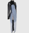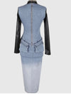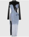 Chic Style Notes: Command attention with the Denim and Leather Long Sleeve Dress, a bold fusion of edgy sophistication and modern allure. The thigh-high zipper split and mixed-material design create a statement-making piece perfect for fearless fashionistas.