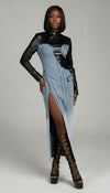 The Denim and Leather Long Sleeve Dress with Zipper Thigh-High Split is a show-stopping piece that combines daring design with modern elegance. Ideal for women who love to push fashion boundaries while maintaining a sleek, polished look.