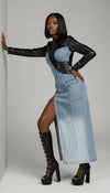 Chic Style Notes: Command attention with the Denim and Leather Long Sleeve Dress, a bold fusion of edgy sophistication and modern allure. The thigh-high zipper split and mixed-material design create a statement-making piece perfect for fearless fashionistas.